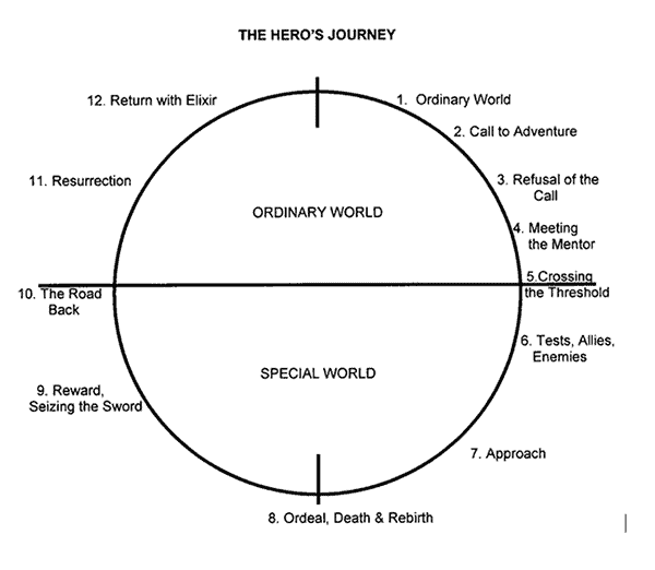 I bogen The Hero With a Thousand Faces beskriver Joseph Campbell, det han kalder The Hero’s Journey. Campbells påstand er, at der er en grundlæggende mytisk struktur i de historier, som vi omgiver os med – eller I hvert fald i de vellykkede af slagsens. Heltens mytiske rejse kan ifølge teorien findes i utallige forklædninger på tværs af kulturer og genrer, men ligegyldigt hvor godt de er skjult i fortællingens form, vil de centrale elementer altid være til stede. Det betyder, at alle psykologisk tilfredsstillende historier har en række skridt, som fortællingen skal igennem. Joseph Campbell identificerer disse 12 skridt som: