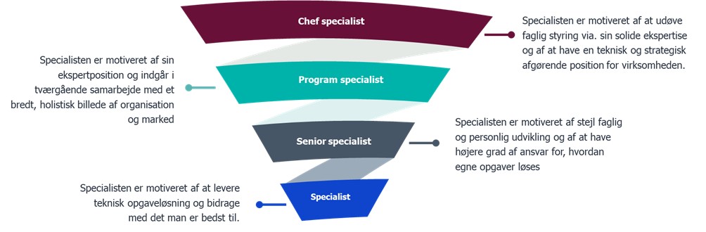 Specialister er altså primært interesserede i at specialisere sig yderligere! De ønsker at fremme deres faglige ekspertise og udnyttelsen af deres kompetencer. De er drevet af at udvikle, lære og vokse. Ikke dermed sagt at ydre faktorer som løn, fordele, sikkerhed og arbejdsvilkår ikke betyder noget, men specialisten har i særlig grad et stort behov for oplevelse af faglig dygtiggørelse og tilfredshed.