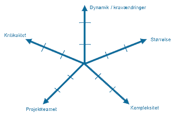 I agil projektledelse er der en meget stor tro på de gode folk, for der er ikke så meget andet at støtte sig til. Det bevirker dog også, at agil projektledelse ikke er det rigtige valg, hvis du har nogle meget uerfarne medarbejdere i projektgruppen. Den agile form er også bedst, hvis der er fælles adresse, og gruppen ikke er for stor. Dette er nødvendigt, hvis man vil afholde de daglige, korte, stående SCRUM-møder, som efterhånden er blevet en integreret del af agil projektledelse, og som har bredt sig i it-branchen som en steppebrand. På de daglige SCRUM-møder opdateres man og fordeler opgaver i såkaldte sprints, der typisk tager mellem 2-4 uger. Prioriteringen af sprints laves af kunden, som holdes tæt på projektet i typisk agil stil. Søstjernemodellen – Hvornår er agil projektledelse rigtig? Jan Pries-Heje har udviklet en enkel model, som hurtigt giver et overblik over om agil eller plandreven projektledelse er rigtig for et projekt. Grundet sin form kaldes modellen populært for Søstjernemodellen. Modellen har som en søstjerne fem arme, som er henholdsvis dynamik/kravændringer til projektet, projektets størrelse, projektets kompleksitet, projektteamets sammensætning samt erfaring, og endelig projektets kritikalitet. På en skala fra 1 til 3 på hvert af de fem punkter kan man bedømme sit projekt, hvor 1 peger mod agil projektledelse og 3 mod plandreven projektledelse. Der undervises i modellen på kurserne om it-projektledelse hos Mannaz.