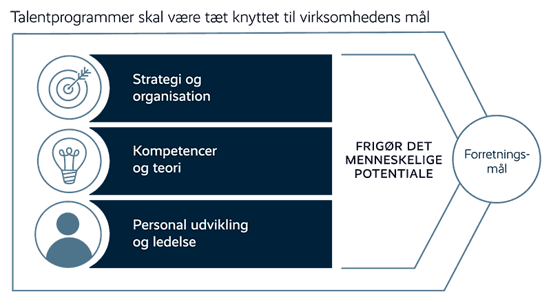Vi co-designer og leverer talentprogrammer specifikt tilpasset jeres kontekst for at understøtte den løbende udvikling af jeres virksomhed og skabe et attraktivt arbejdsmiljø. Og vi sikrer effekten i hverdagen, f.eks. ved at inddrage de nærmeste ledere i opfølgningsdialog med hver enkelte leder eller specialist og bruger cases fra det virkelige liv som grundlag for læring.